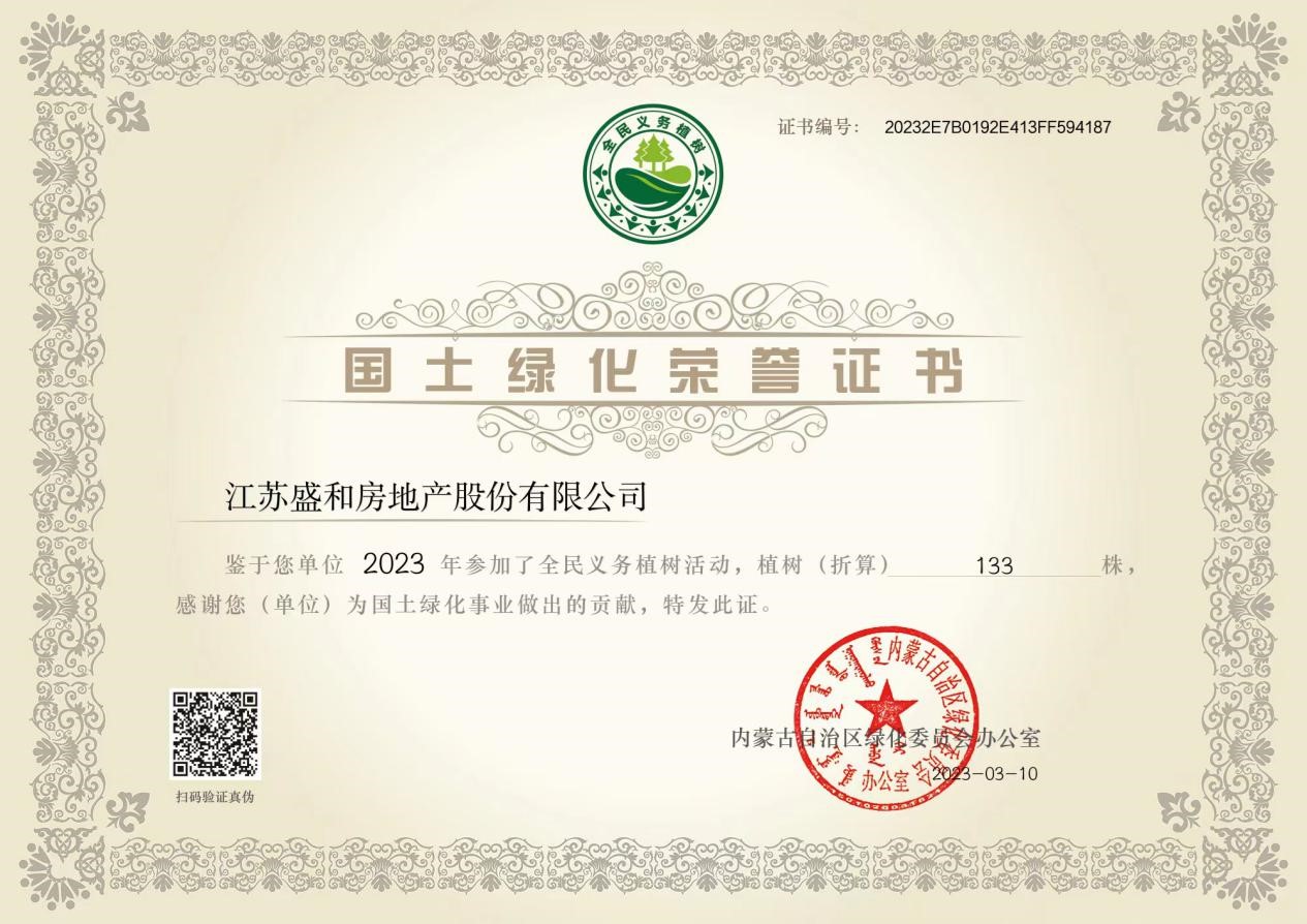 植樹造林,綠化祖國(guó),是我國(guó)的一項(xiàng)基本國(guó)策。今年,盛和房產(chǎn)參與全民義務(wù)植樹“獻(xiàn)一份愛心 護(hù)沿黃生態(tài)”項(xiàng)目,協(xié)助推進(jìn)黃河流域生態(tài)保護(hù)和高質(zhì)量發(fā)展。公司此次共捐資植樹133株,獲得內(nèi)蒙古自治區(qū)綠化委員會(huì)辦公室頒發(fā)的國(guó)土綠化榮譽(yù)證書。